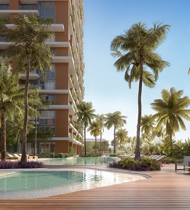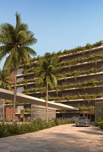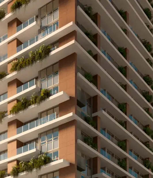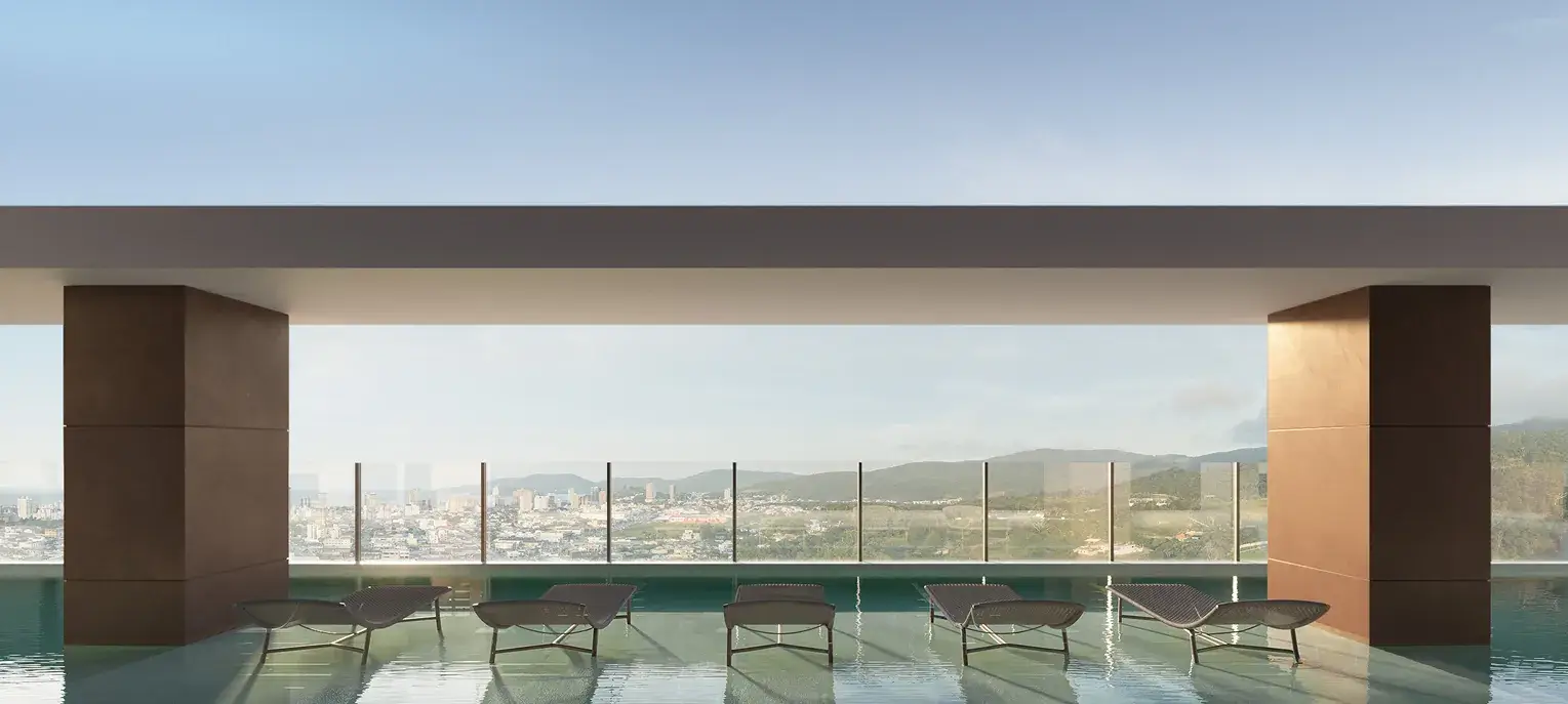No Isla, a fachada se revela como um gesto em movimento. Lâminas brancas se projetam em diferentes ritmos, criando leveza e dinamismo. Floreiras integradas às varandas reforçam a biofilia. O contraste entre o branco, a terracota e o cinza elegante traduz a sofisticação. No topo, a piscina em balanço marca o coroamento do edifício — símbolo de ousadia e refinamento.