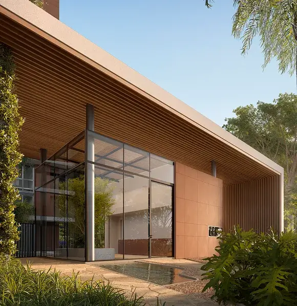 paisagismo exuberante, esquadrias amplas, materiais nobres e design sofisticado.